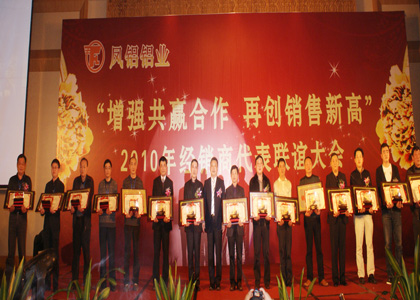 本報(bào)訊 記者陳曦嵐報(bào)道:3月7日,正值陽(yáng)春三月,鳳鋁鋁業(yè)召開了以“增強(qiáng)共贏合作,再創(chuàng)銷售新高”為主題的全國(guó)經(jīng)銷商代表聯(lián)誼大會(huì)。這天,公司內(nèi)彩旗飄舞,人流如潮,來(lái)自全國(guó)各地的300余名經(jīng)銷商代表臉上洋溢著喜悅的笑容,齊聚一堂,準(zhǔn)備共享這年度盛典,共繪鳳鋁鋁業(yè)2010年新藍(lán)圖。